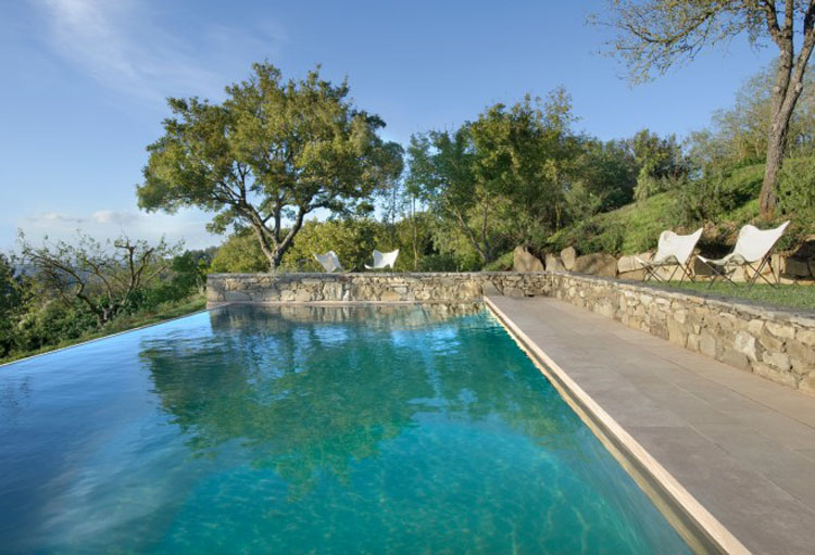 Monteverdi is set in the small village of Castiglioncello del Trinoro, in authentic Tuscany, at a height of 2,600 feet – oops, around 800 metres. Comprising a small number of luxury villas, a small hotel, restaurant and cafe, rest and tranquility is assured, with long distance views across the countryside south and west. Ideal for a relaxing stay with Montepulciano, Pienza and Montelcino all within easy driving distance – across some interesting Tuscan roads! The hotel rooms are large, very private and beautifully equipped – restoration is traditional with shades of natural Tuscan colours – pale render, natural stone, old timber and terracotta ceilings and carefully crafted details – ceilings, doors and locks and the wonderful showers. Farrow and Ball…you could have a whole colour chart from just here.
