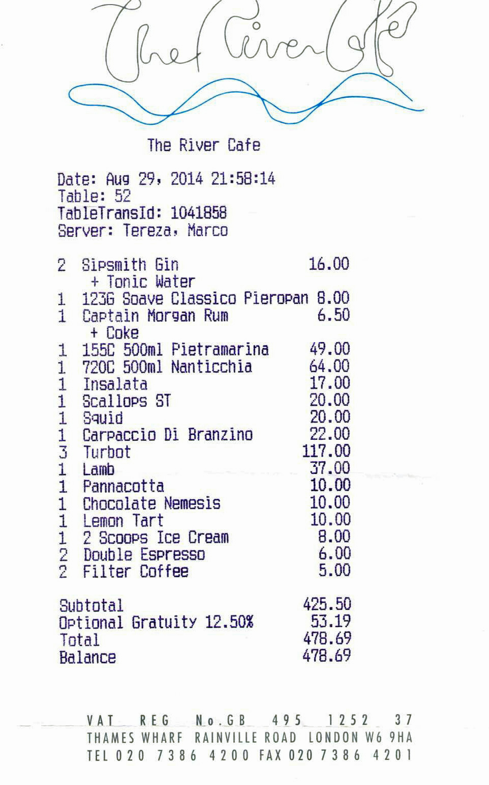 The building [and the restaurant] was designed by Richard Rogers, and the studio is next to the restaurant. So not bad for an office canteen. The menu is seasonal [of course] and changes twice a day. It’s been a long ambition, now fulfilled, to eat at the River Café, as much for the architectural and italian connection as the Michelin Star. Food as it should be and perfect staff.