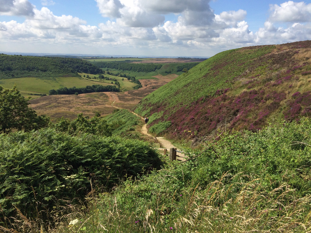We’re equally torn between the North Yorks Moors and the Yorkshire Dales. Both are spectacular and beautiful, but the Moors tend to be softer – the stone more yellow sandstone and the roofs red pantile replacing the original thatch. At this time of year the heather is just coming into flower, turning the landscape from a dusky golden brown to a vivid purple. It doesn’t last long, but the way the landscape changes and brightens helps to reinforce the welcome these moors offer. Today was a walk around the Hole of Horcum.