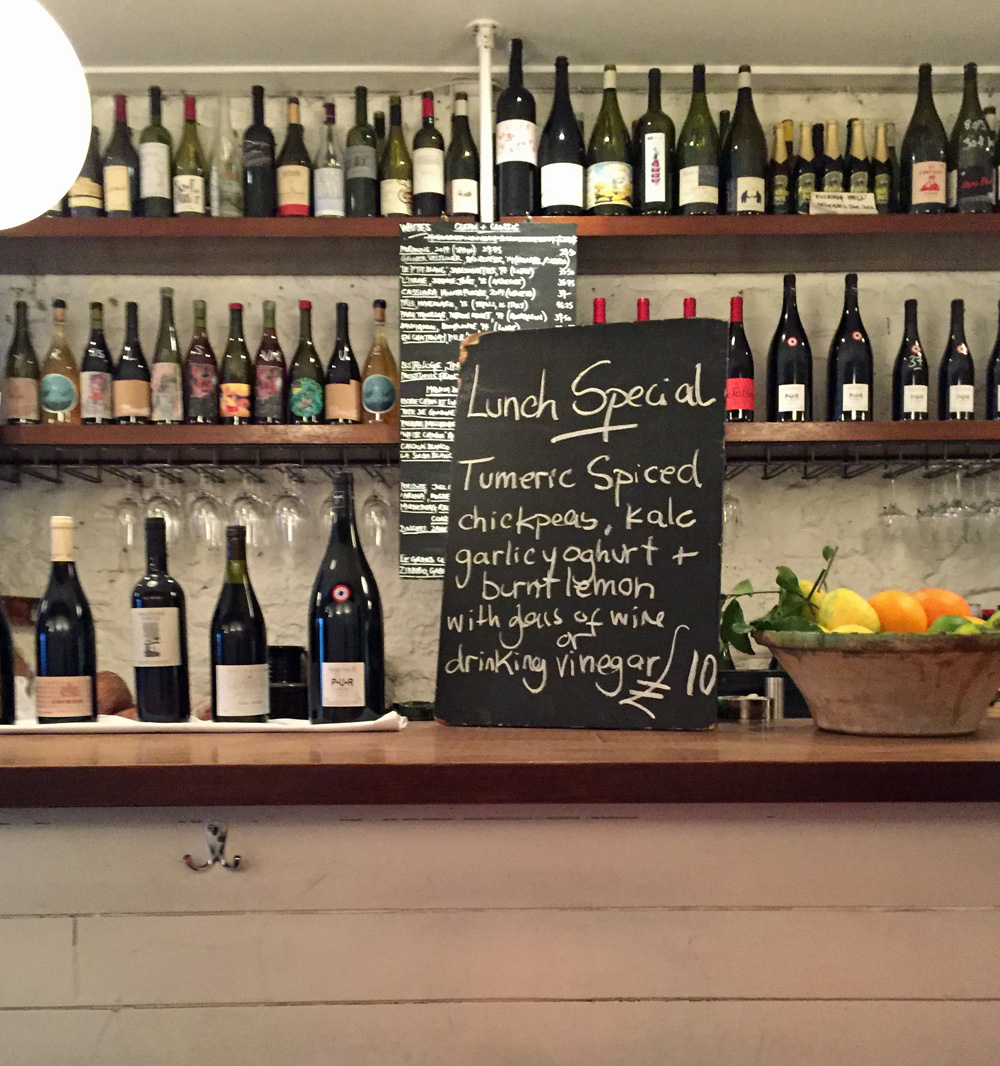 Finally inside – it was like negotiating the climate change treaty to get agreement to venture in and there was only two of us. We ordered a couple of glasses of wine, from a selection of two or three whites available by the glass. Perhaps we shouldn’t have been surprised that the Pouilly Fumé on offer was the real thing, Unctious. Not some weedy re-badged sancerre. We could have had drinking vinegar. Local water, a couple of simple dishes – the chickpea dish of the day, and a pomegranate, fennel and labneh salad. Maybe a couple of coffees. £56, most of which was the wine. Now, this was a 50/50 success. One half would go back and back for the unusual and interesting organic [i.e. untreated?] wines. The other half would declare independence and go elsewhere. Take your pick.