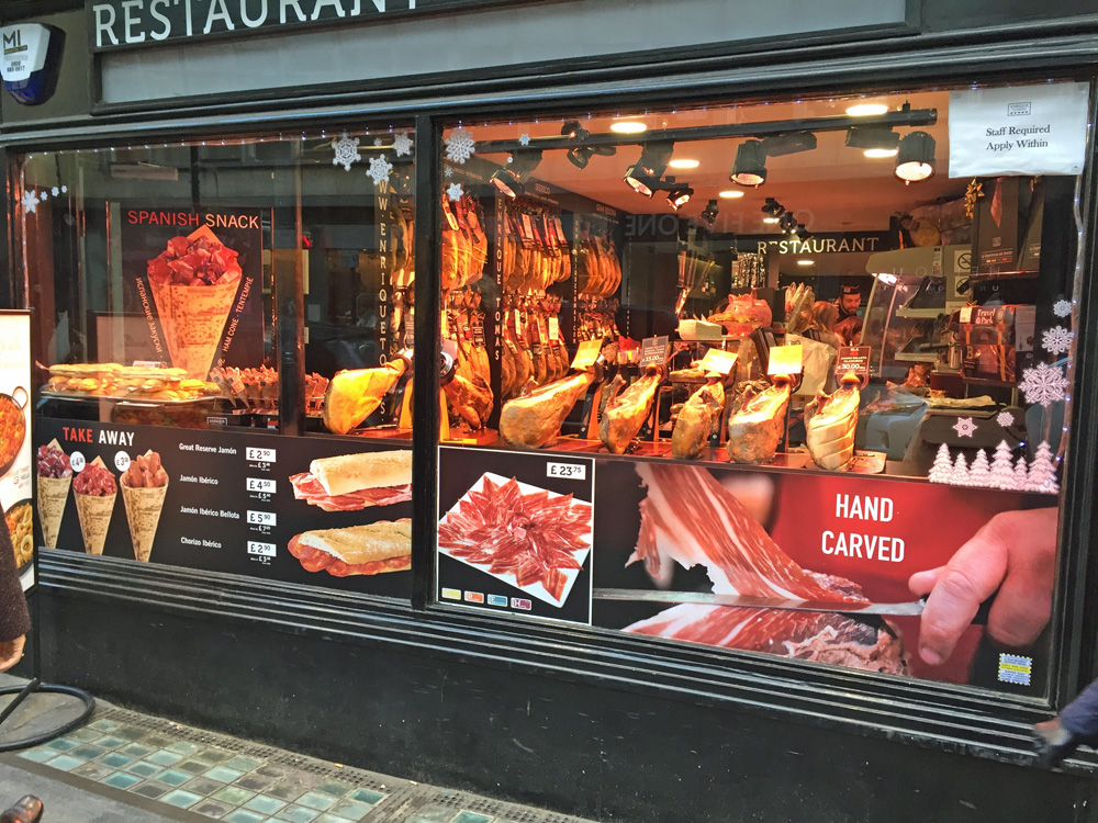 Wandering eagerly down Dean Street [home to the Pizza Express Jazz Club] we finally spy the place. Lots of restaurants here, mostly busy, some packed, local places and national names. We pause at L’eto, a branch of which we enjoyed in the Fulham Road. That one had no alcohol, this one only breakfast and cakes; no basis for a leisurely lunch. At first glance [and second and third] Duck Soup didn’t look inviting; a couple of blokes at the table in the window, and an electrician balanced on a pair of steps trying to feed some wiring through a hole. No-one else. A hand-written menu on the window that we could almost, but not quite, read. Mostly the space is taken up by the bar [and why not…ed]. Nice puns – “Duck Bills” where the bills hang waiting to be paid…