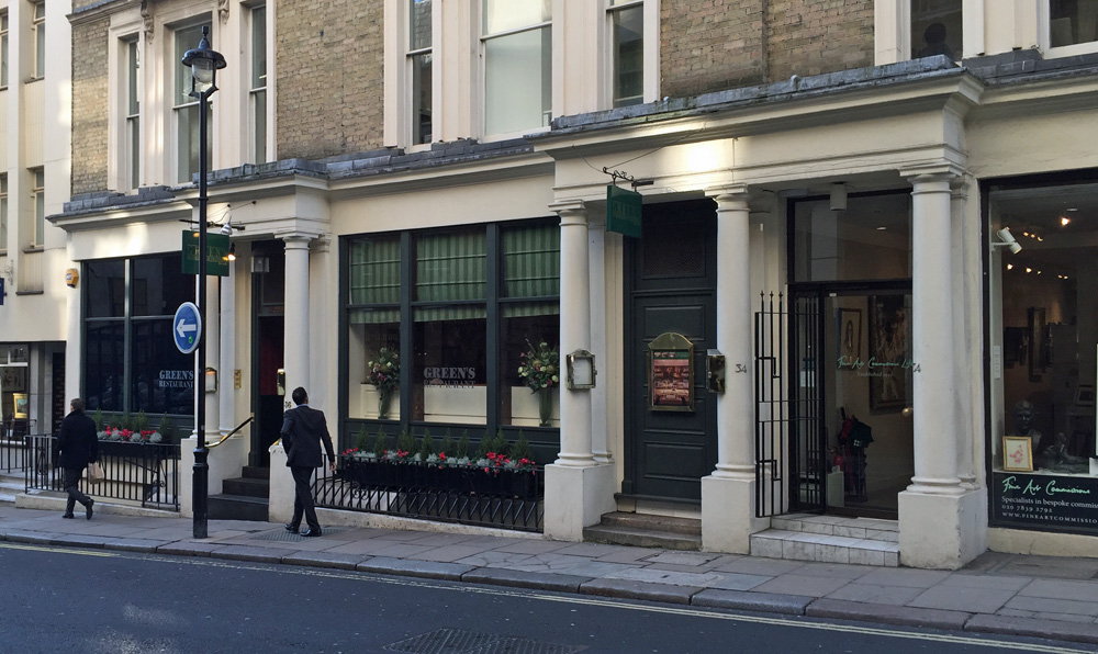 Lunch today – a very rare business lunch – at Green’s in St James’. Cosy, proper, luxurious, attentive, formal but relaxed, good food and [probably] wine – though being January and lunch it was water only.