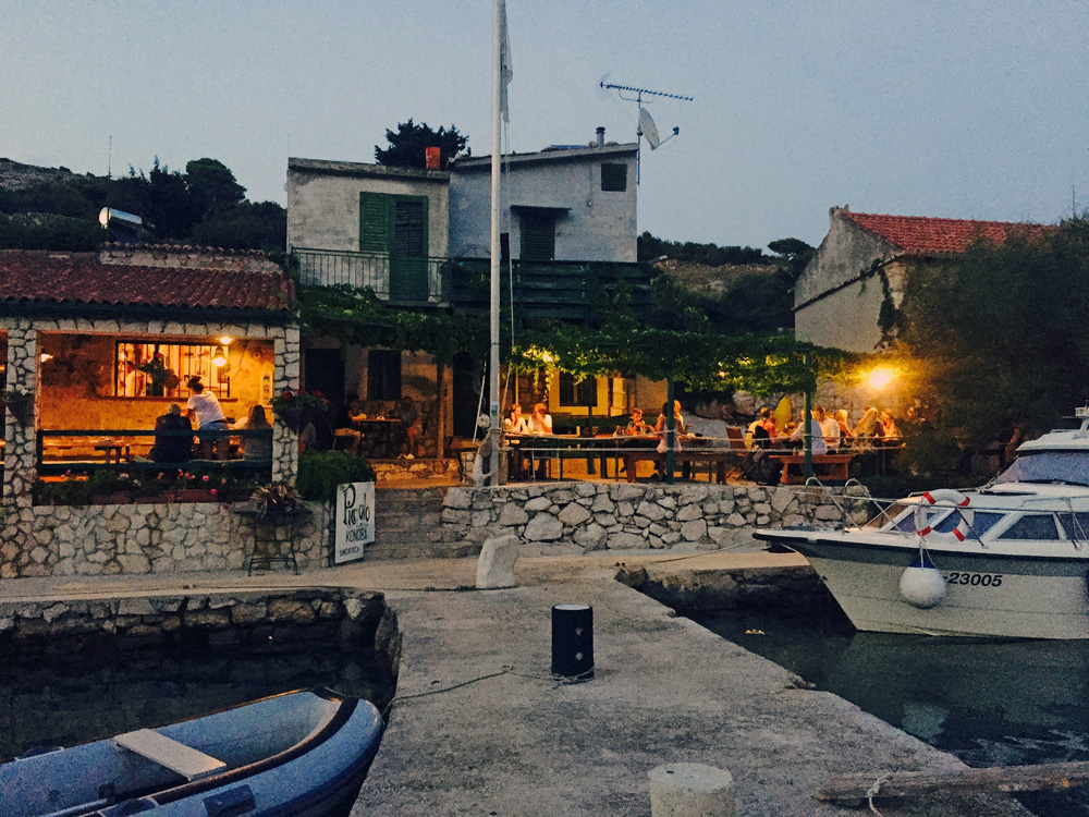 So, in Smokvica Vela are two restaurants. Piccolo and Mare. Piccolo is the one in the guide, and enjoys a very sunny position amongst the little grouping of single storey holiday houses. Mare sits on its own, in the shade. Get the picture. The evening we were there all Piccolo’s five moorings were full, five boats were ranged along their jetty and others crammed in along the waterside. Others anchored in the bay and came in by dinghy. Mare – just two boats, and one went in by accident. It takes quite some skill and logistics to run a successful restaurant on an island with no other facilities. You can’t just set up in one of the precious designated anchorages and hope it will all work out in the end. The secret is good cooking and then the reputation spreads. So, Piccolo’s thriving and Mare? Well, Mare were supposed to have five moorings too but we guess the maintenance wasn’t worth it if there are no customers.