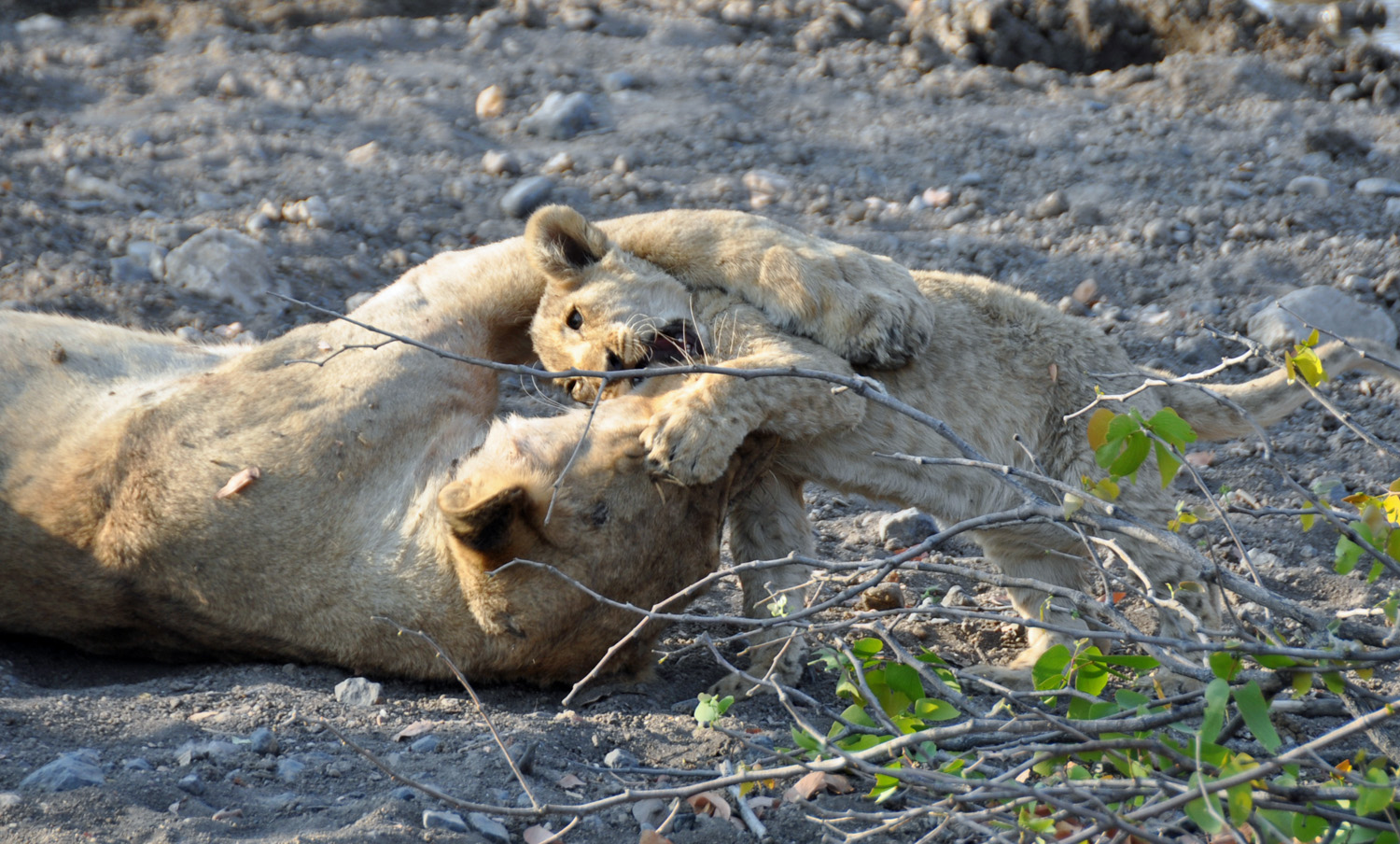 An early evening drive finds us parked alongside a pride of lions. The adult females are out hunting, leaving the large male in charge of the remaining five or six young adults, and three young cubs. We watch – and listen – as the teenagers bully the cubs, part of their preparation for survival. We are within 4-5 metres. Astonishing.