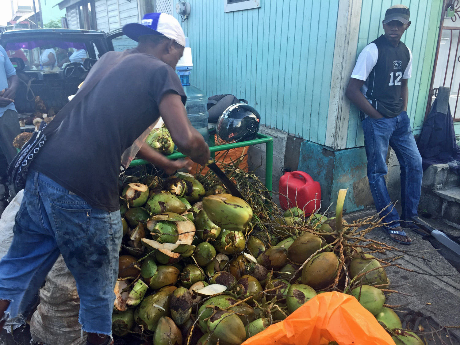 We’re up early the following morning and into Portsmouth for the Saturday market, a couple of streets of locally grown fruit and vegetables. We buy fresh coconut, watching the top sliced off with machete before drinking the milk straight out of the top. Passion fruit and bananas get added to the bag, ready for breakfast.