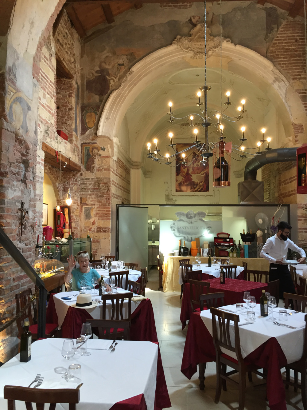 Santa Felicita is in a converted church. There are a few tables invitingly placed on the street, and the weather is beautifully warm, but to gain the best effect we eat inside.
