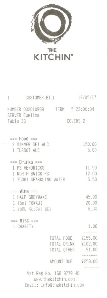 Let’s get this right out of the way at the beginning, without any preamble; dinner at The Kitchin was absolutely perfect. No question. One of the very best. So, 11/10 at least. For the food, that is. And the service. The location is a bit so-so, especially in the driech Scottish weather – Leith has promised so much over the last thirty years, but still fails to deliver. Many of the recently refurbished shops and eateries are empty, the Ocean Terminal and the huge Scottish Government buildings failing to bring enough passing trade. The converted apartments look similarly forelorn, the paint peeling, the rainwater pipes overflowing and sinister “no parking” signs discouraging lingering. There’s the attraction [?] of the former Royal Yacht Britannia, moored in the dock. You can visit, of course, but access is through Ocean Terminal – presumably where visitors disembark from cruise ships. It is an unremittingly soulless example of a modern, out-of-town shopping complex. Full of shops you really don’t want to visit, interspersed with the usual crowd of chain fast food restaurants. Welcome to Edinburgh…?