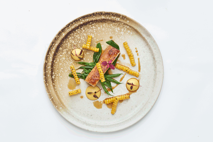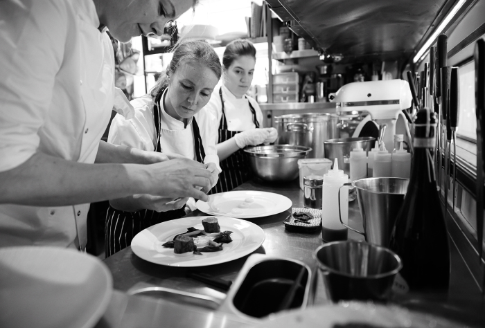 We had the tasting menu, served by a couple of very slender chaps in smart suits – you know the sort – jackets a bit too short and a popular shade of not quite dark blue. Very à la mode. If you imagine the inside of a small building, three-quarters of it was the restaurant for twelve tables [quite small] and the other one-quarter was the kitchen. I’ve seen bigger galleys on a dinghy. And all on display.