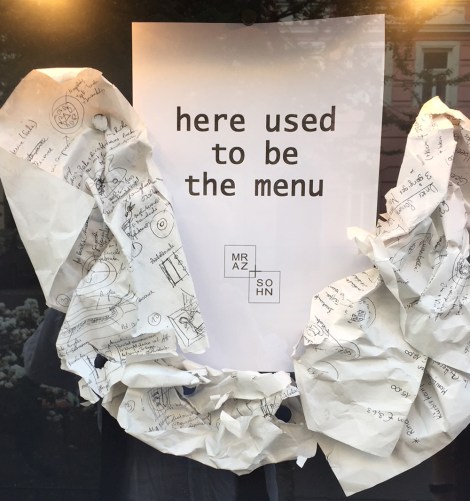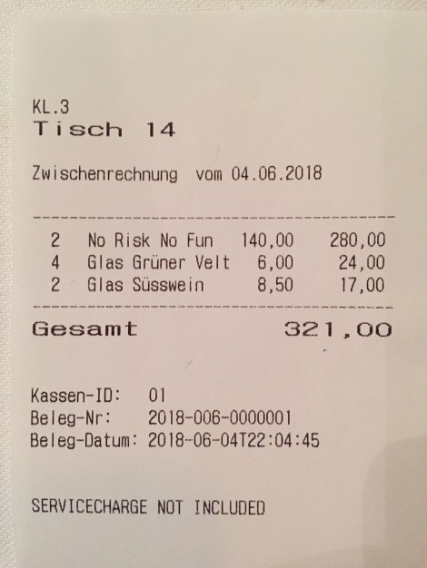 Mraz und Sohn is slightly on the outskirts and we walked from the centre, there and back – about 35 minutes each way. You pass through a slightly edgy area doing this – all safe though – and arrive at a small door with the menu displayed in a frame outside. Or what used to be the menu. Once inside you are seated, rewarded with a drink and then shown the menu. Or rather a large platter with the ingredients for that night’s meal. Langoustines, chicken, cheese, vegetables [even in Austria they have them!] to check you have no dislikes or allergies. After that, sit back and be entertained. Good and varied, very good value glasses of wine accompanied the many, many dishes and the bill at the end simply said ” 2 x no risk, no fun”. A wonderful journey.