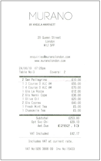 This time, after finding just the right occasion (45th wedding anniversary- were miking it for all it’s worth) we head for Murano in Mayfair. In August – presumably holiday time – there’s just one menu. Six groups of dishes and, in true Italian style, you just choose three, four or five as you wish (or six). Tonight it’s £55 for three courses and a Spritz. Time Out said, simply…