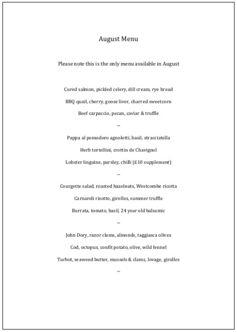 In the end it’s easy. In reverse order it’s Apricot Soufflé; Duck breast, confit duck leg, pickled blackberries; Pappa al pomodoro agnolotti, basil, stracciatella and a shared Carnaroli risotto, girolles, summer truffle to start. Because a good risotto is heavenly and we’re always on the look out for the perfect soufflé (very good here). We drink wine by the glass – great recommendations and good value. Honest. Even the Chateau Climens…
