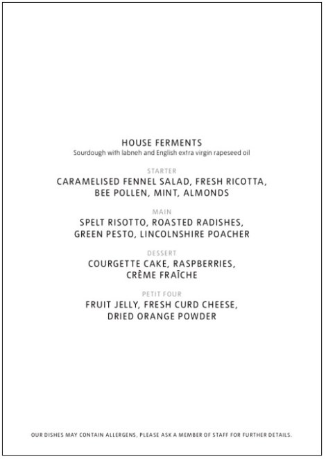 Simple, very tasty Nordic inspired vegetarian 3 course menu (£45 each mind plus drinks, but it did include entry to the exhibition), plus some sourdough starter and little petit four to finish. Very friendly staff – the Italian server disappeared into the kitchen and returned with the recipe for the courgette tart written on the menu. That’s dedication for you.