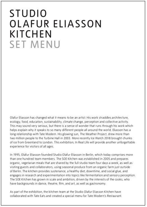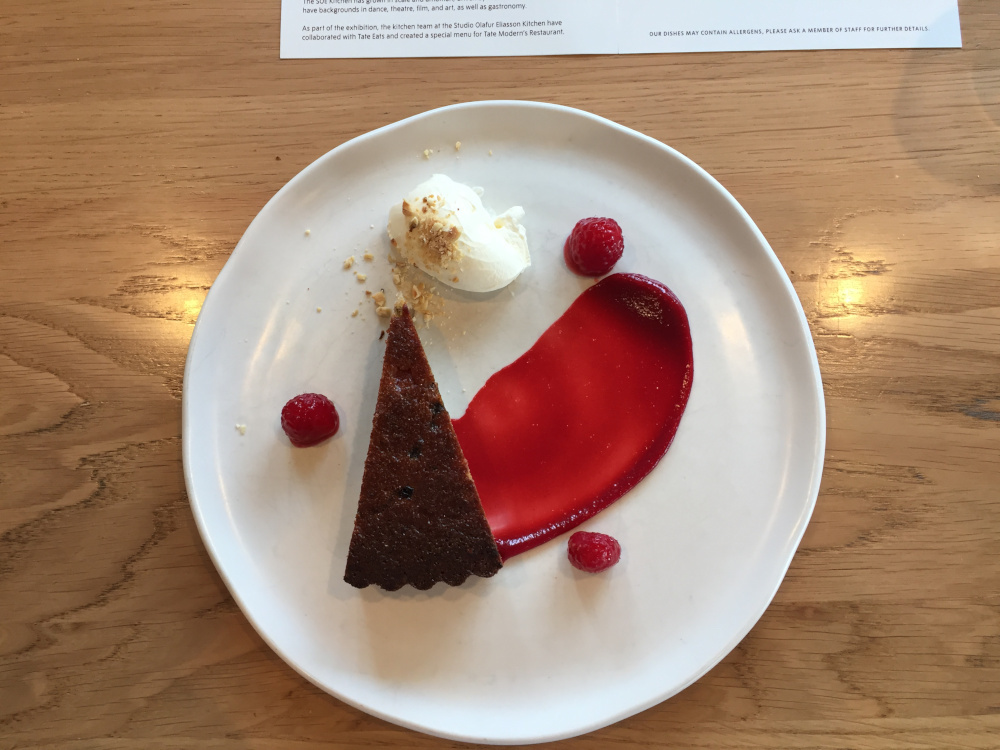 So the current exhibition. Olafur Eliasson believes food is integral to art. We’re not going to disagree. In fact, food before art any day. So, when he sorted his current exhibition he insisted on “designing” the Tate restaurant’s menu, with the emphasis on food miles. Naturally, we had to give it a go…