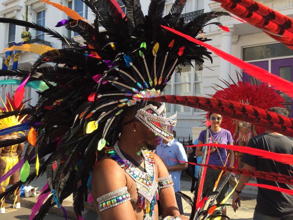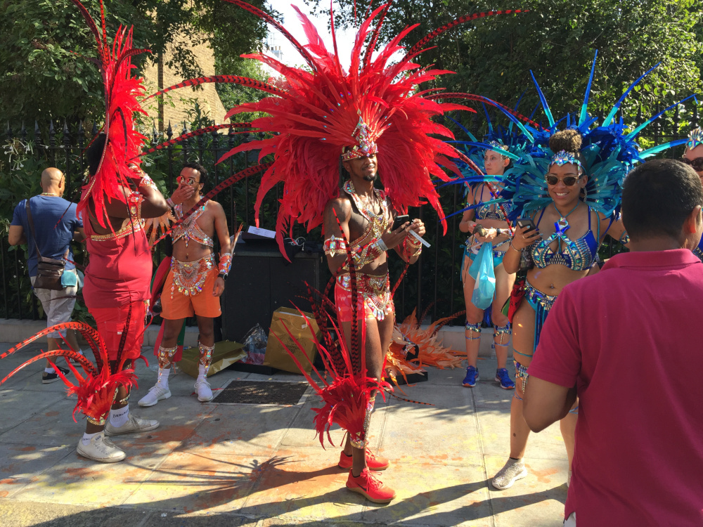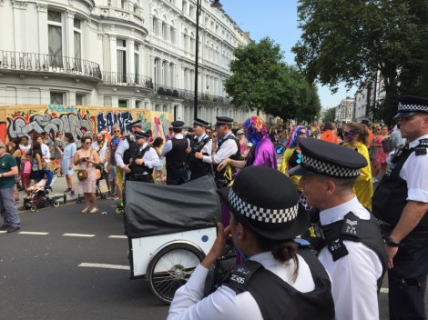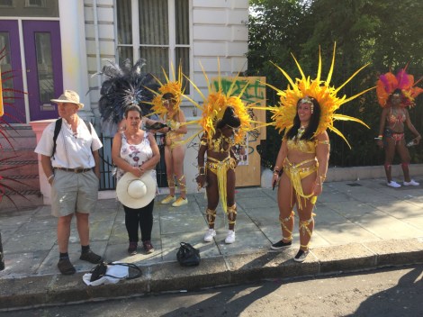 There’s a friendly police presence and you have to show proof of your hotel booking before they let you through the security cordon. Compared with last year, when it poured down, this year the weather is, well, Caribbean. Thirty degrees with great slices of sunshine. Sunday is family and children’s day, less raucous and maybe a touch safer? At 3pm Sunday and Monday there’s a 72 second silence in memory of those who died at Grenfell Tower. The tower isn’t within the cordon, but definitely part of the neighbourhood and still standing as an eerie reminder of the tragedy.
