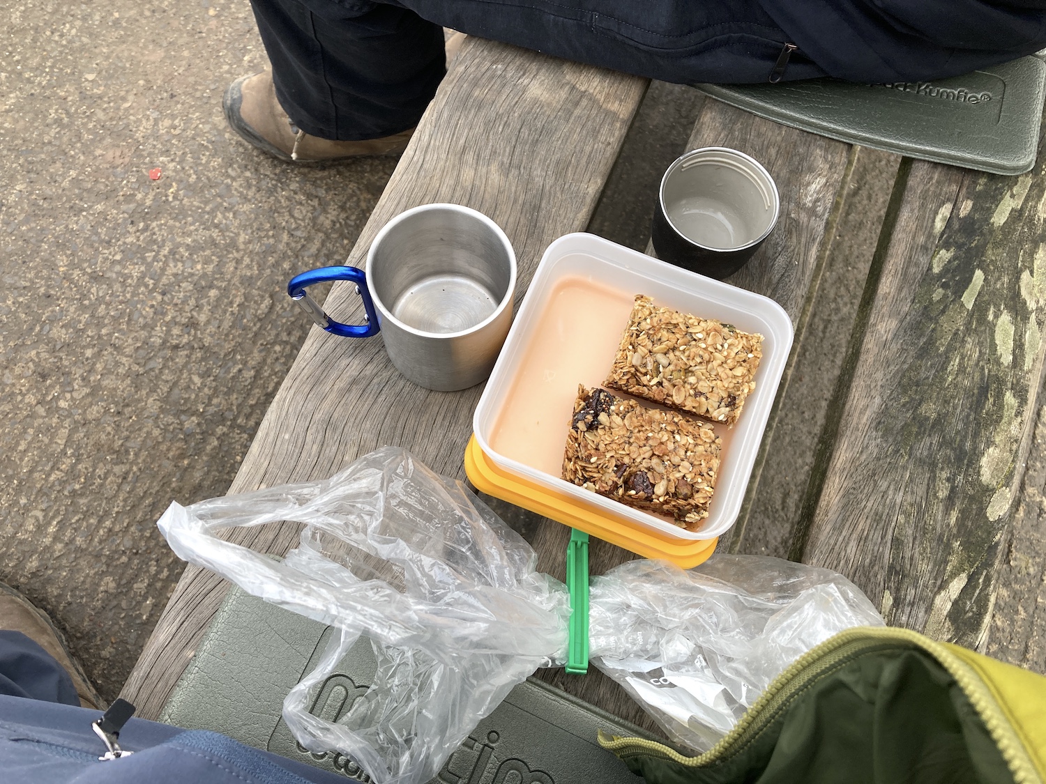 Key to all this is food. In addition to the Naked fruit bars for emergencies, we carry a picnic notable for both its lack of variety and strict adherence to the menu. It’s creation is clearly divided – like Theresa May we have “girls’ jobs” and “boys’ jobs”. So, for two people we carry: