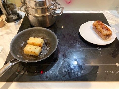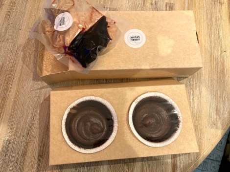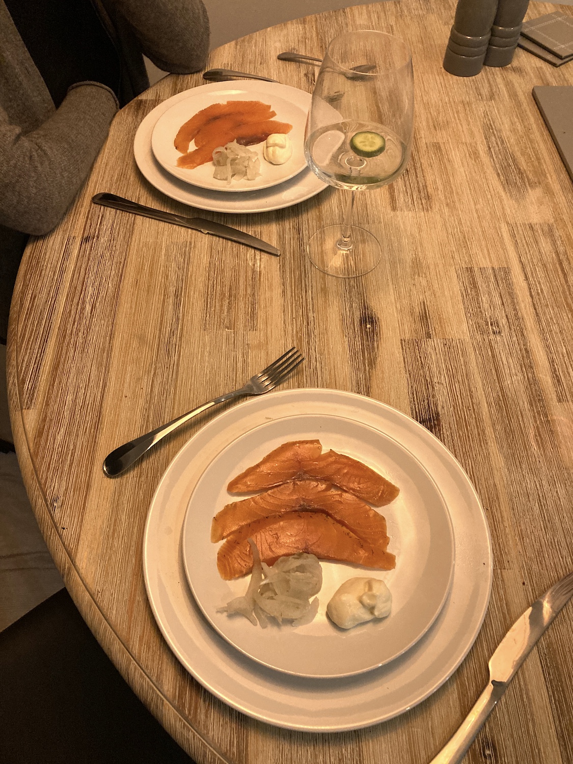 A sturdy cardboard box, lined with sheep’s wool insulation, and an un-wrapped bottle of Newton Johnson’s 2019 Walker Bay Pinot Noir [very, very nice] thrust into your hand. Yes there’s some plastic inside, but it’s fairly minimal. Inside beautifully prepared and neatly packed treats. We start off with a loaf [yes, a whole loaf] of Haxby Sourdough and Haford Cheddar Custard, followed by Cold Smoked Salmon. The stuffed turkey and associated trimmings, chicory root and chocolate fondants, and root vegetable mince pies completed the feast. Truly a feast.