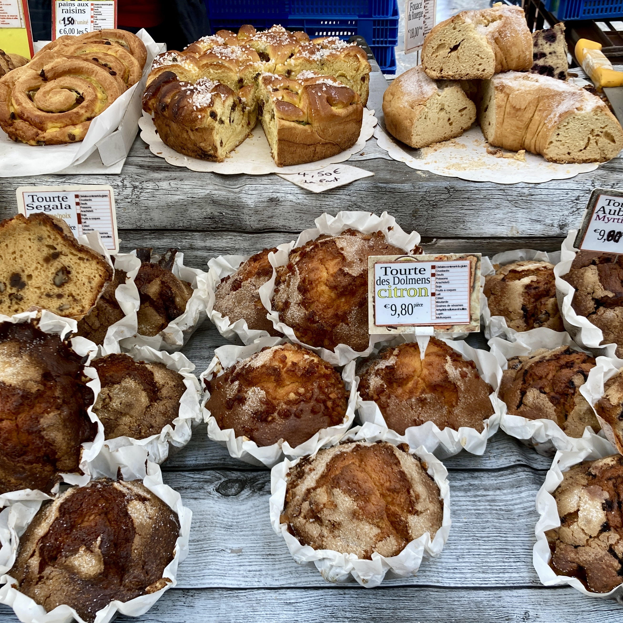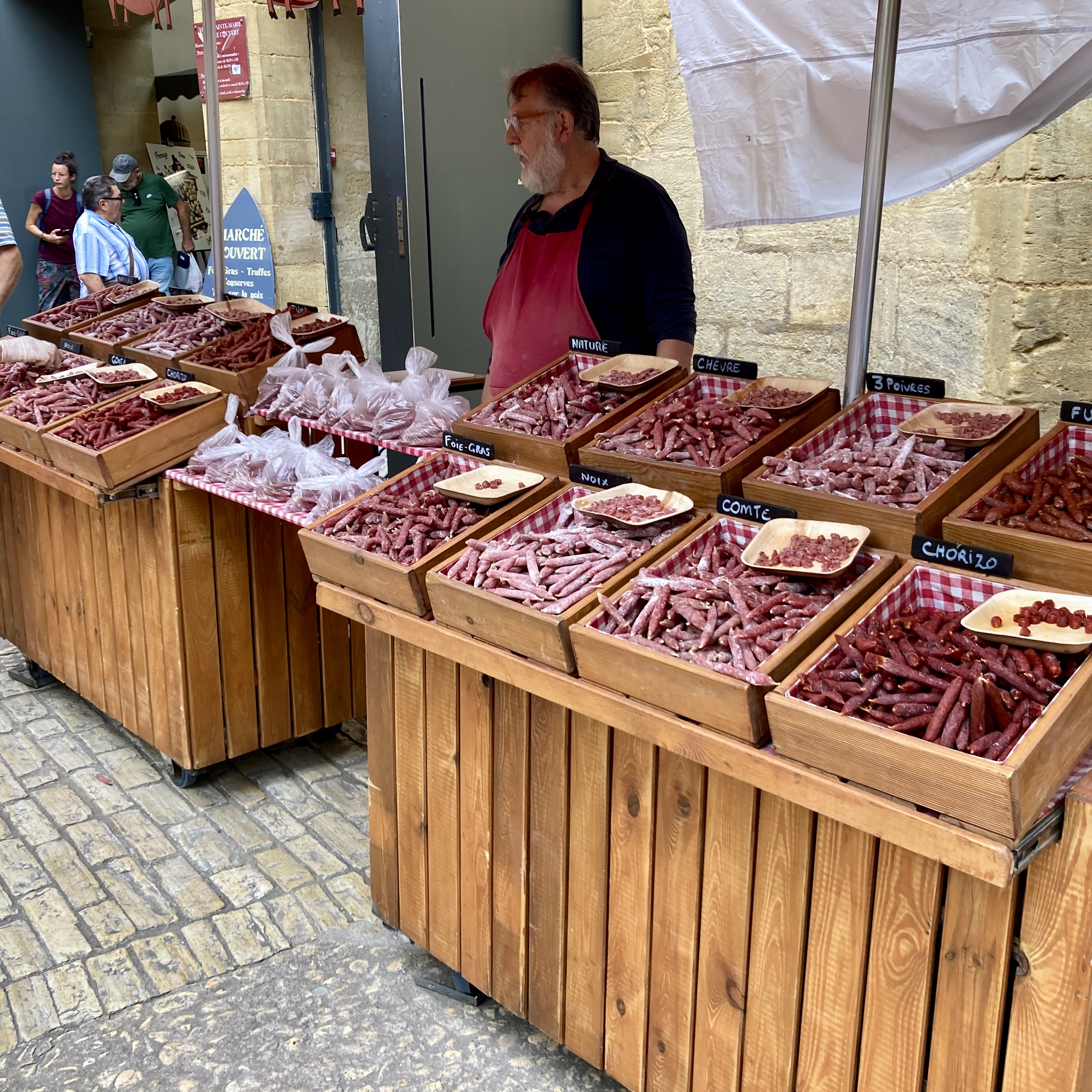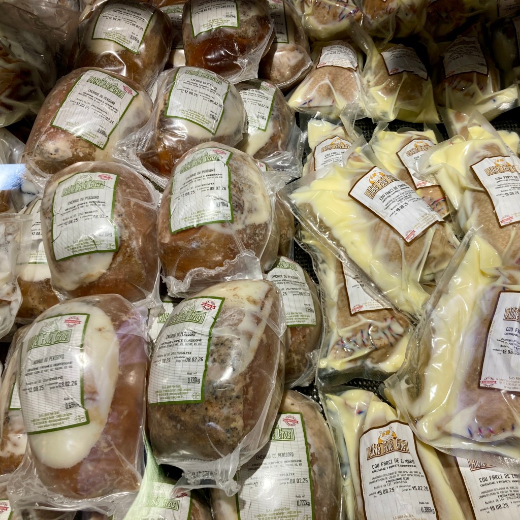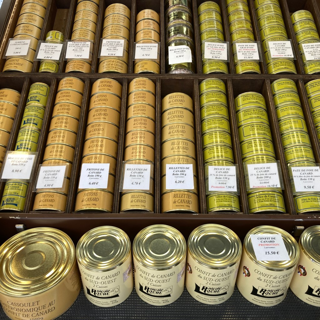 Foie Gras features highly in this part of the world and tins and tins of it, as well as the many unmentionable parts of ducks and geese salvaged in the process, appear at stalls in the huge market. Together with bread, wine, truffles, oils – just lovely stuff. No cheap battery stalls here like at home.