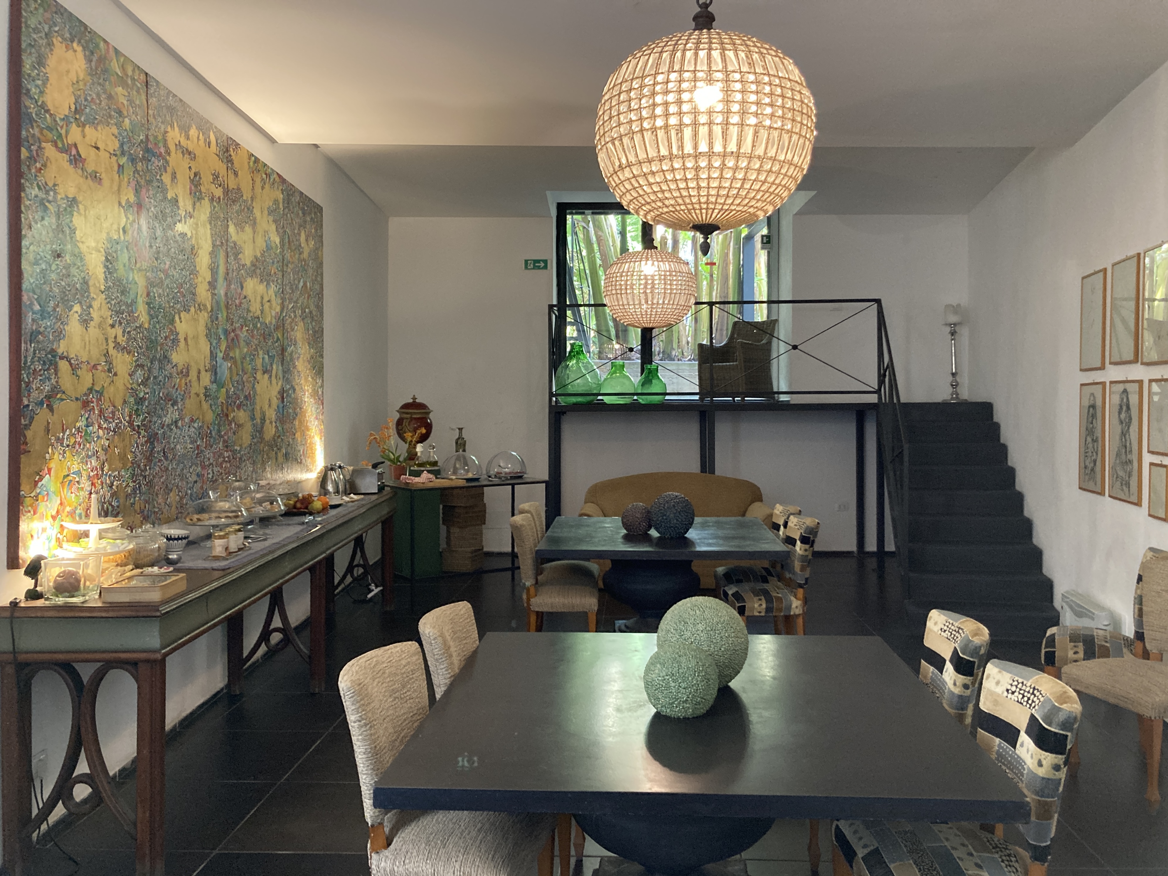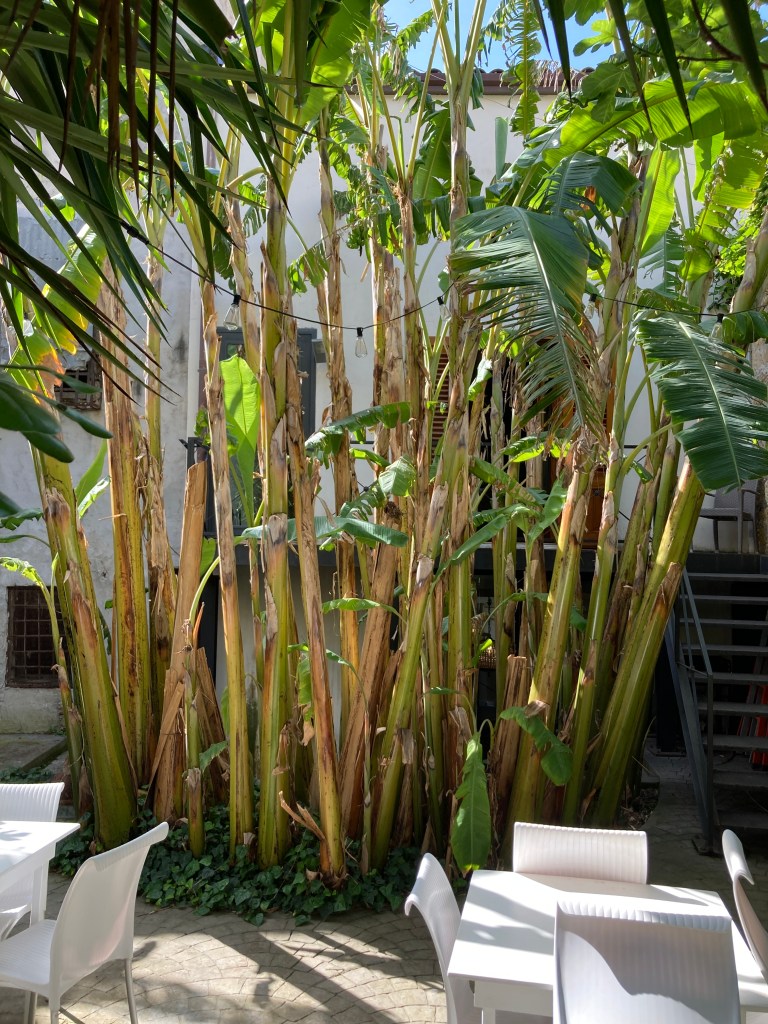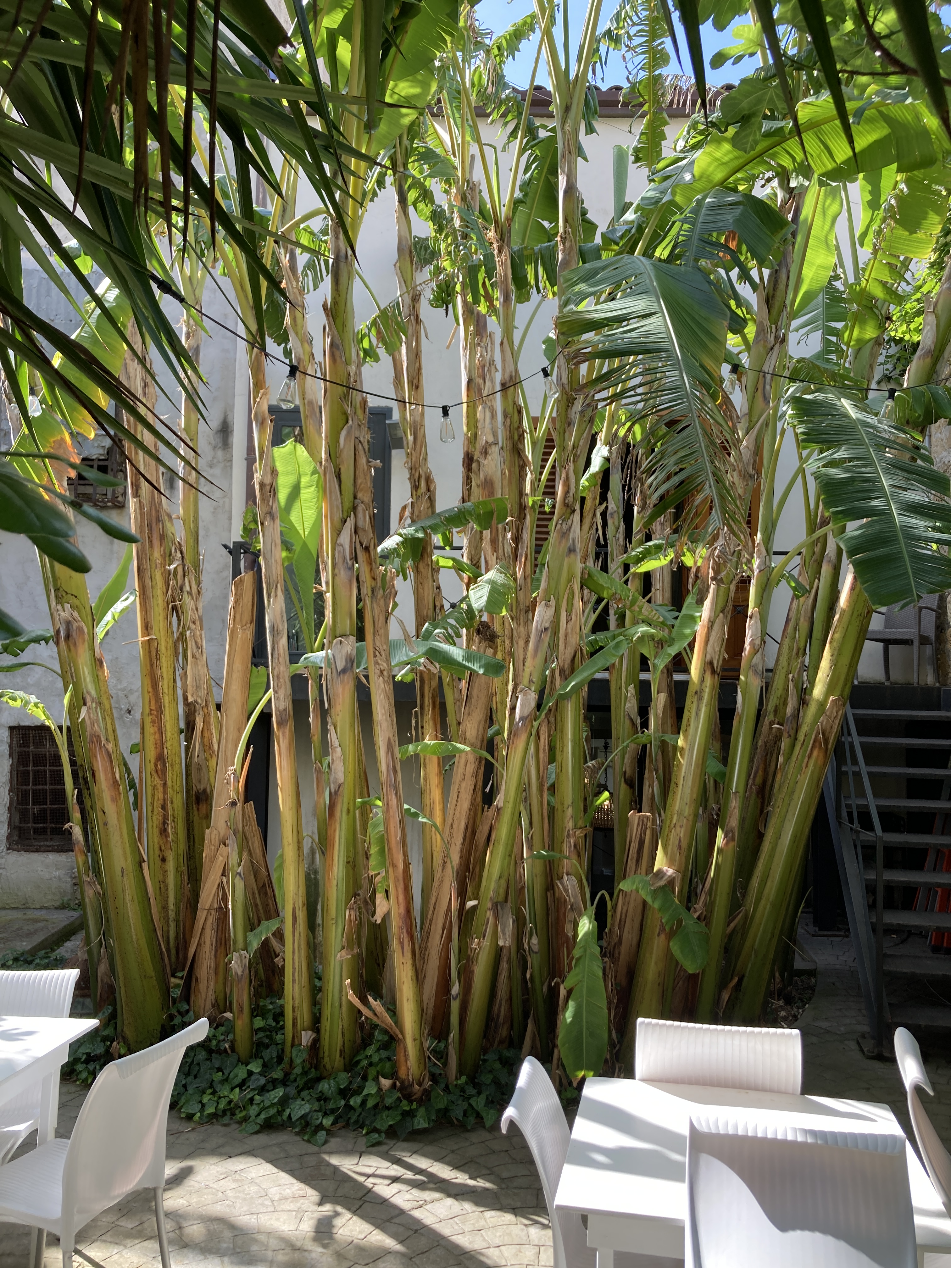 We’re staying at a small B&B – just five rooms set behind the inevitable shabby frontage, complete with Acrow props holding up the first floor balcony. Inside, however, calm and smart. We have a room at the back with two bathrooms and a view down into a small garden. Really peaceful.